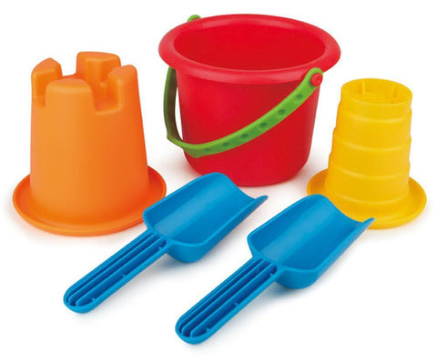 The HAPE 5-in-1 Beach Set by HAPE features a vibrant collection of beach toys: a red bucket with a green handle, an orange sandcastle mold, a yellow tower mold, and two blue scoops, all arranged neatly on a white background.