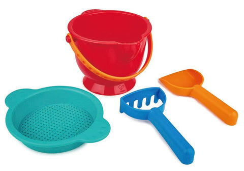 The Hape Beach Basics by Hape includes a red plastic bucket with a yellow handle, an orange scoop, a blue rake, and a turquoise sieve—ideal for creating sand masterpieces. These colorful toys are perfect for playing in the sandpit or crafting imaginative sand creations.