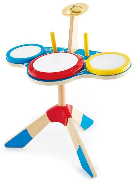 The Hape Drum & Cymbal Set is a vibrant wooden toy drum set for children, featuring three drum pads in red, blue, and yellow. It includes two yellow drumsticks to enhance hand-eye coordination, a small cymbal on top, and blue and red accents on the tripod legs and base. The set stands securely on three colorful legs.