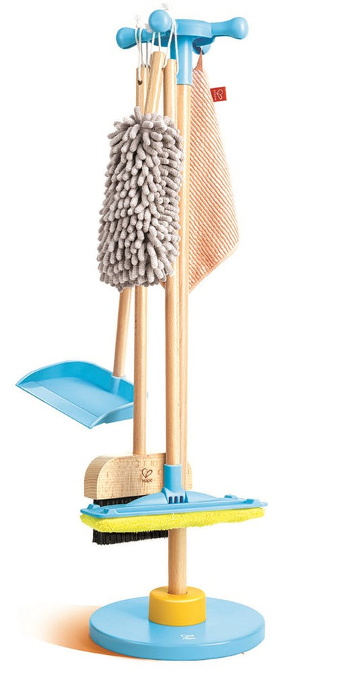 The Tender Leaf Home Kitchen by Tender Leaf is a charming playset designed in light blue and natural wood for endless pretend play. This children's wooden kitchen set includes a stove with four knobs, an oven, a sink, and hooks that hold pink pots, pans, and cooking utensils. Additionally, a red checkered towel hangs on the side for added realism.