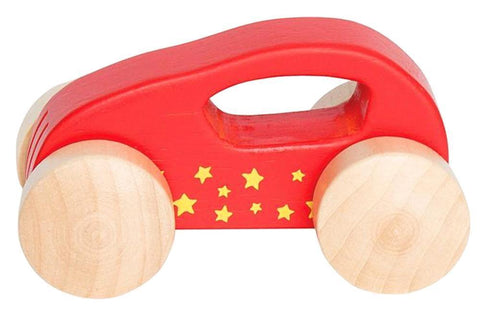 The HAPE Little Auto Red by HAPE is a red wooden toy car featuring a convenient cut-out handle on top and four natural wood wheels. The body of this toddler hand-powered car is adorned with playful yellow star designs on both sides.