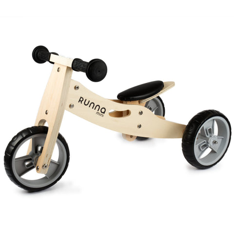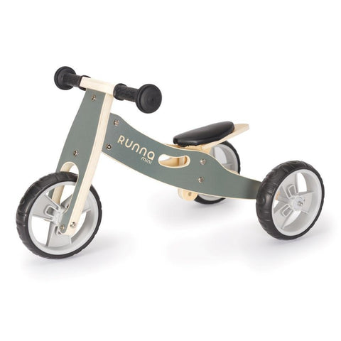 A compact balance bike for toddlers with a sleek design, featuring a light gray frame labeled "Runna Mini - Gumtree" in white letters, complemented by black seat and handlebars, and three wheels with white spokes.