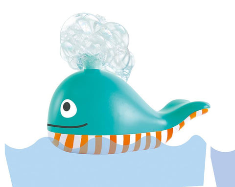The HAPE Bubble Maker Whale, a cartoon-style bath toy, features a smiling face and an orange-striped underbelly as it floats on water. This jolly whale from HAPE has transparent bubbles bubbling out of its blowhole. Set against a white background with blue waves at the bottom, it's perfect for bath time fun.