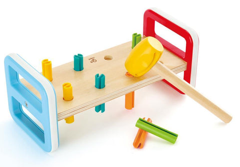 The HAPE Block and Roll baby walker is a green and natural wood walker featuring a wooden handle. This multipurpose cart includes colorful geometric blocks in red, yellow, blue, and green on the base. It has four wheels with red accents and cut-out handles on the sides for easy handling.