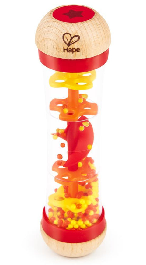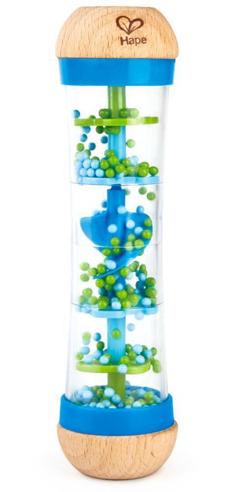 The Hape Beaded Raindrops - Blue by HAPE is a clear cylindrical wooden rainmaker toy filled with blue and green beads that cascade down sections separated by plastic barriers. Designed for sensory development, it features blue and wooden caps on the top and bottom, with a Hape logo on one of the wooden caps.