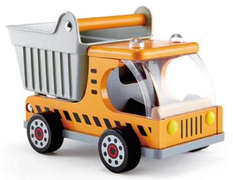 The Hape Dumper Truck is a colorful children's toy featuring an orange body, gray wheels with circular patterns, and a gray bed. The cab showcases a clear windshield and detailed headlights. Black stripes on the side of this Hape toy truck make it perfect for imaginative play.