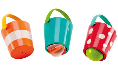 Three vibrant toy buckets from the Hape Happy Buckets Set by Hape are displayed in a row, perfect for bath time fun. The first bucket is orange with white stripes, the second is turquoise with green handles and toys inside, and the third is red with white polka dots. Each bucket has a handle and playful design ideal for water play.