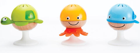 Three vibrant wooden sea animal rattles from the Hape Stay-put Rattle Set, crafted by Hape, are displayed on white stands. From left to right: a green and yellow turtle, an orange octopus with a yellow head, and a blue whale. These delightful toys are perfect for enhancing fine motor development and cognitive skills in children.