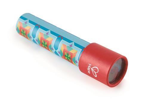 A young child is playing with the HAPE SHAPE Sorting Box from HAPE. The child is holding a yellow square block, trying to fit it into the appropriate slot on the vibrant cube. Other shaped blocks, such as a red cylinder, are scattered across the white table like little garden creatures waiting to be sorted.