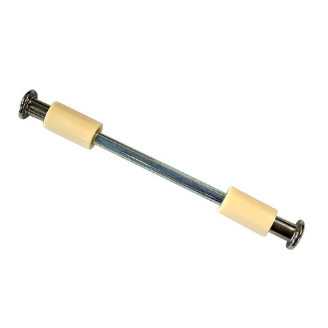 The RUNNA Runna Mini Rear Wheel Axle is a metal shaft with two white cylindrical spacers and silver ends on each side, designed to resemble an axle for the Runna Mini 2-wheeler. It features a balanced construction with identical components on both ends, and the white spacers are positioned near the extremities of the shaft.