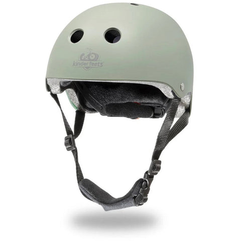 A silver sage Kinderboard Kinderfeets Toddler Helmet designed for children. The helmet features ventilation holes on top, an adjustable fit dial system, black straps with a buckle, and soft interior padding for comfort and child safety.