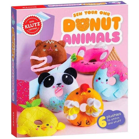 The Klutz Sew Your Own Donut Animals craft kit, brought to you by KLUTZ, features a vibrant box showcasing five adorable felt donut animals, including a panda, cat, and unicorn. Inside the sewing kit are all the supplies needed to create 6 plushies, proudly marked with a red seal labeled "100% Klutz Certified.