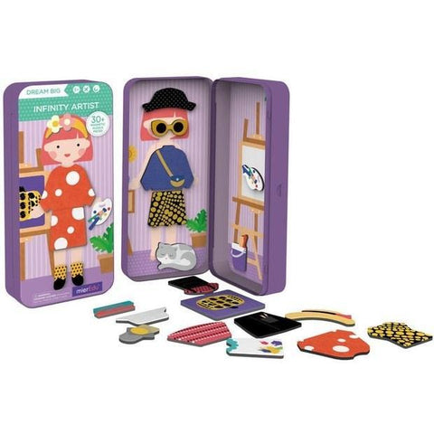 The MIEREDU Magnetic Puzzle Box - Infinity Artist is displayed. This travel set includes two artist figures, various interchangeable magnetic clothing pieces, and accessories inside a purple tin case. The set encourages STEAM play, imaginative play, and creativity. Dream big with endless possibilities!