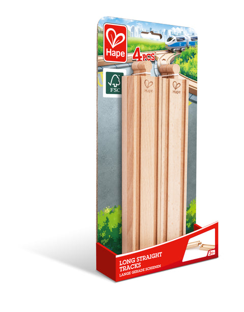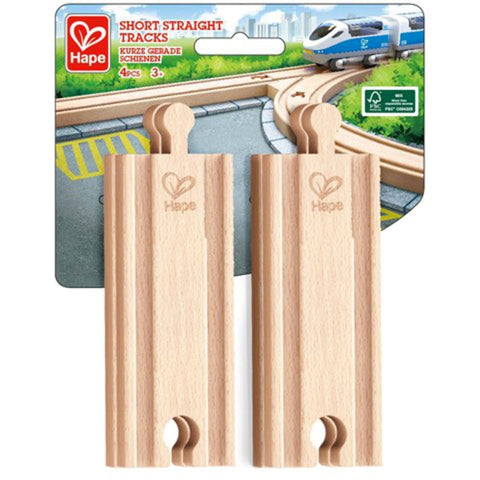 Four Brio World Medium Straight Tracks, each with connectors at both ends for easy assembly. These tracks are straight with a light natural wood grain finish. The connectors feature round and circular ends to fit together seamlessly, making them perfect for expanding your BRIO World railway set with additional track pieces.