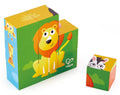 This six-sided block puzzle challenges kids to re-create familiar jungle animals. The six jungle animals are: a lion, giraffe, zebra, crocodile, monkey, and a cute elephant. This puzzle supports matching and an understanding of cause and effect. Promotes dexterity and hand eye co-ordination. Six puzzles into one set of blocks. Nine solid wooden blocks with edge-to-edge print.