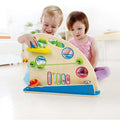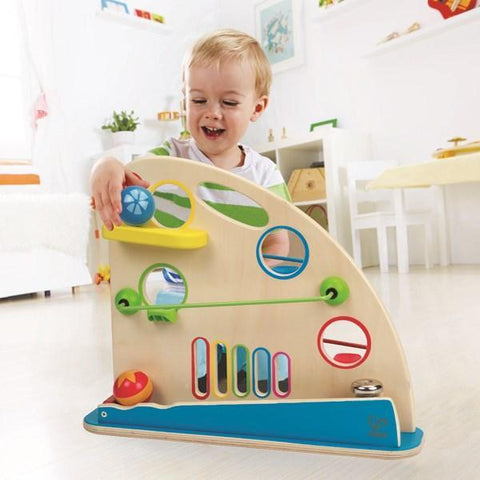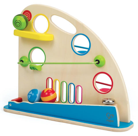 Colourful wooden balls, peek-a-boo holes and fast race tracks create a 2-sided mountain of fun. Watch the balls roll from top to bottom.