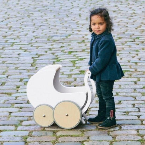 Made from sustainable birch wood and finished in a crisp, modern white with non-toxic water-based paint, it features large rubber-trimmed wheels for extra stability and smooth movement on any surface. The Kinderfeets Pram – White is both practical and timeless, encouraging confidence, mobility, and creativity in one elegant design.