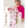 - Contains: One two-storey wooden dolls’ house with three distinct rooms, front door, and four arched windows; dolls and furniture sold separately