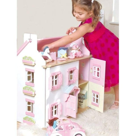 Delight little ones with this charming wooden dolls’ house from Le Toy Van. Designed with a timeless aesthetic and crafted from FSC®-certified wood, it features two spacious levels, three rooms, and four arched windows to spark endless imaginative storytelling. The soft cream exterior is accented with scalloped trim and a deep pink roof, creating a classic look that fits beautifully in any playroom. Perfect for fostering creative play, fine motor development, and social interaction, this house is ready to be filled with family, friends, and fun.