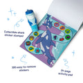 Contains: Shark-themed stamper unit (with refillable sticker stack) and 24-page activity pad